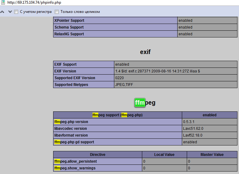Да, и ещё : создал свой пхпинфо http://3ix.co.cc/phpinfo.php ( он же http://69.175.104.74/~kotusmco/phpinfo.php )и там нет поддержки FFMPEG